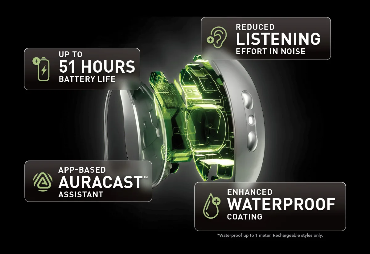 Advanced AI technology helps wearers get answers to simple questions, translate languages, set reminders, make simple hearing aid adjustments, and more.